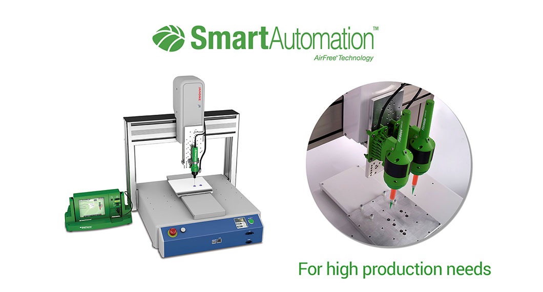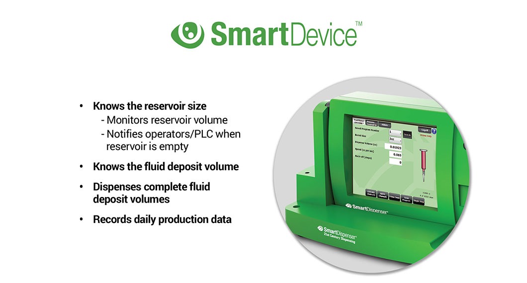 Increases fluid deposit repeatability by as much as +/-20% - 30%* over traditional compressed air systems. SmartDispenser® is an Industry 4.0 device that enables integration, data exchange, decision-making and automatic daily production data reporting.*Repeatability results are fluid dependent