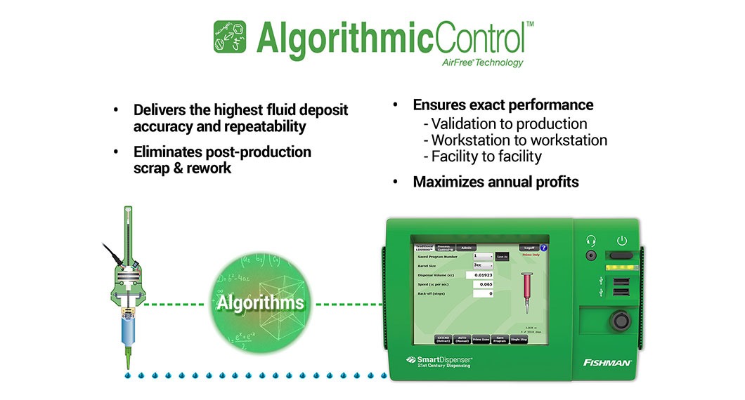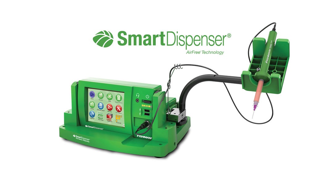 The SmartDispenser® from Fishman® Corporation is used in the application of assembly fluids for a very wide range of industries and products. It features AlgorithmicControl™ and patented AirFree® Technology; innovations that enable manufacturers to assemble products without relying on unpredictable compressed air and error-prone human input. The precision and control gained with the SmartDispenser® greatly improves the assembly process, which increases productivity, yields and profits.